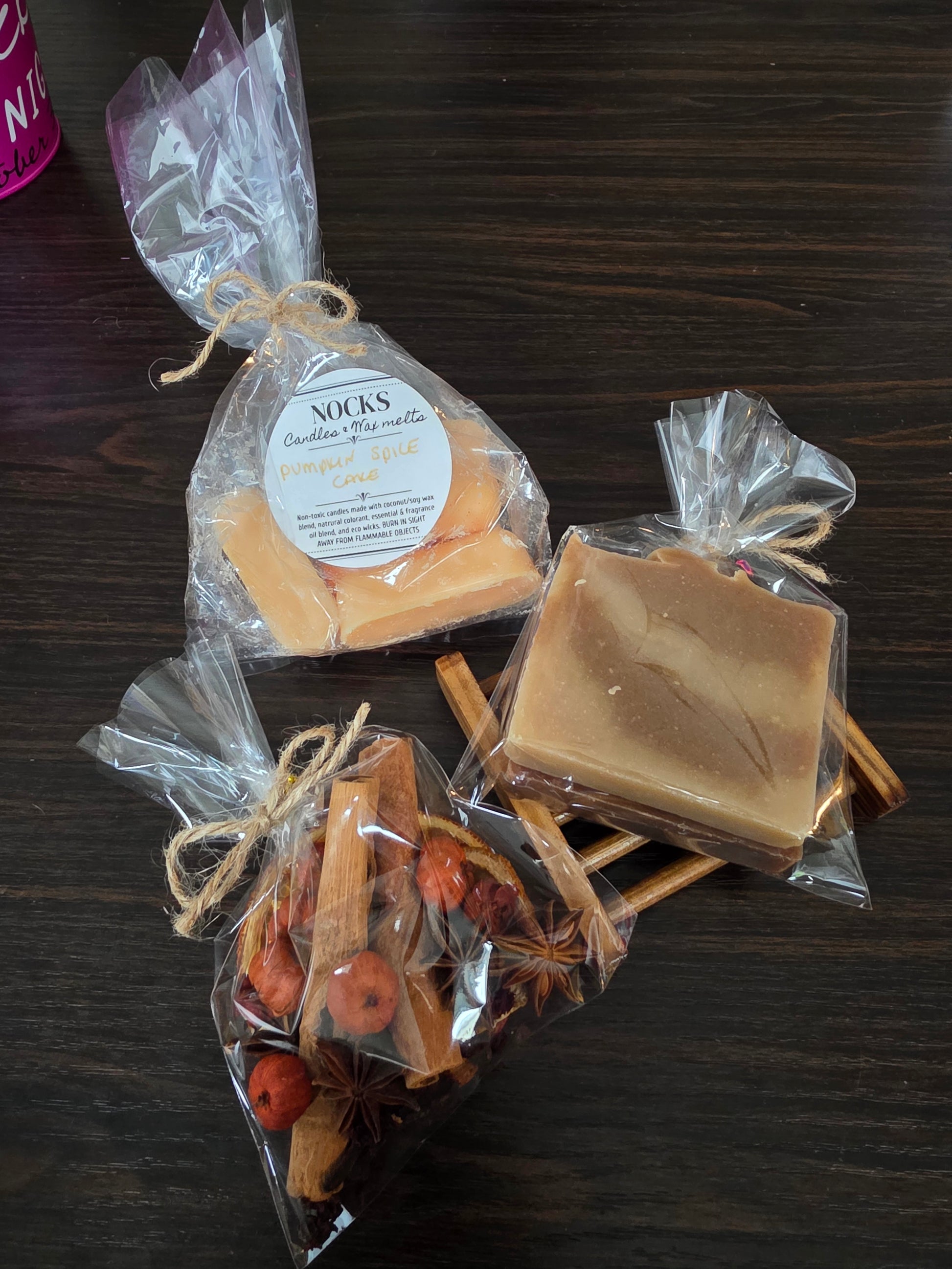 All boo baskets have pumpkin and apple spice soaps (1/2 bars), soap saver, and Harvest Simmer Pot kit. One has an orange & Clove candle, and the other two have pumpkin spice cake wax melts. $25 each! Write in the comment if you want a candle or wax melts 🍁🎃