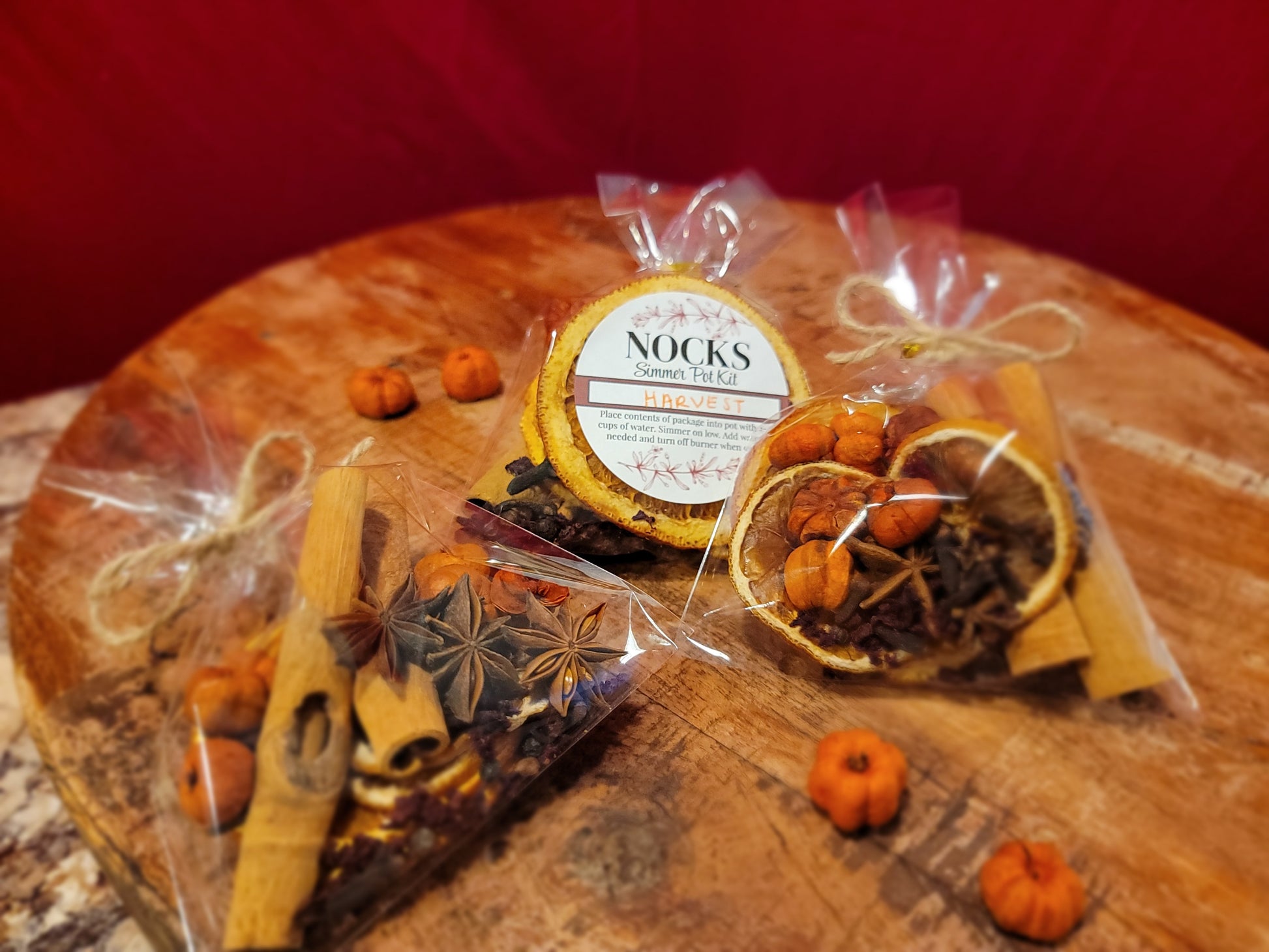 Smells of spicy fall harvest, and produces a beautiful orange liquid. If using half of the ingredients, add 2 cups water and simmer. For a more robust scent and color, add the full bag with 2-4 cups water. Continue adding liquid as needed. Make sure to turn off your burner when you're done enjoying your simmer pot!