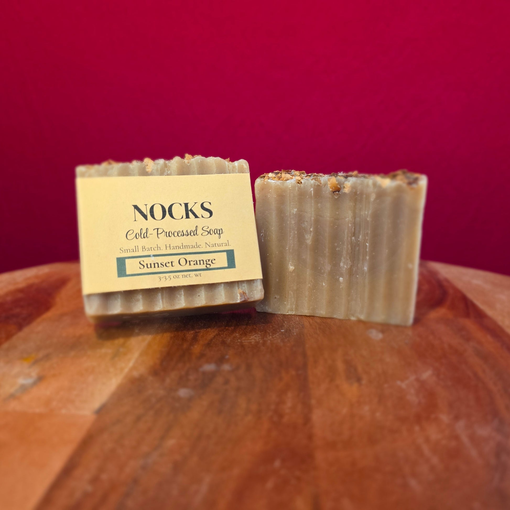 This soap is colored with turmeric and red Moroccan clay, topped with dried orange peel, and scented with citrus fragrance oil.