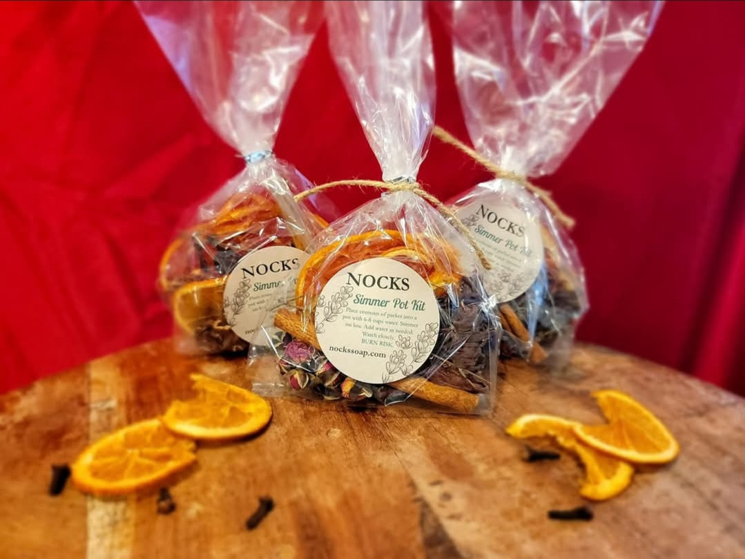 Hand dried orange, cinnamon sticks, dried rose buds, hibiscus flowers, and beetroot, black peppercorns, and clove. This simmer pot gives off scents of spiced citrus and florals, and produce a beautiful rusty pink liquid!